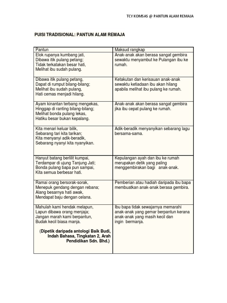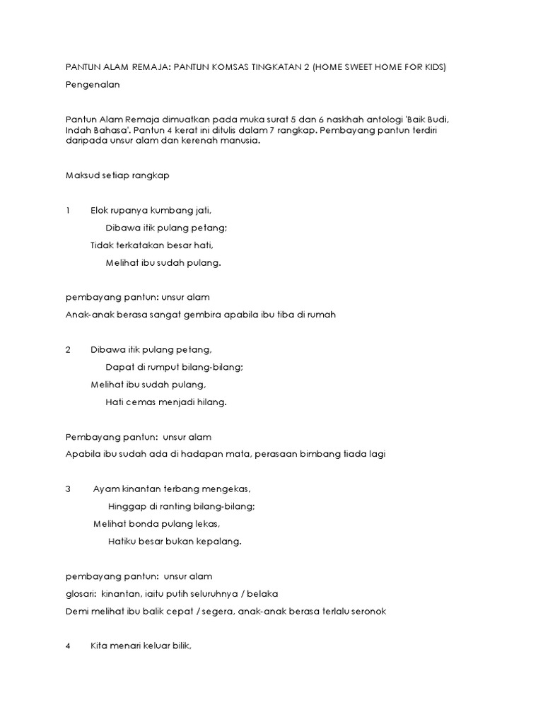 Nota Komsas Analisis Pantun Alam Remaja Antologi Baik Budi Indah Bahasa